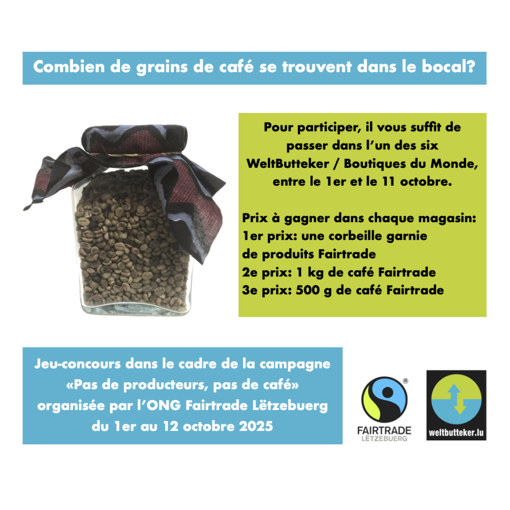 Comme les 5 autres magasins du commerce équitable, WeltButtek Diekirch invite ses clientes et clients à participer au jeu-concours organisé dans le cadre de la campagne «Pas de producteurs, pas de café».